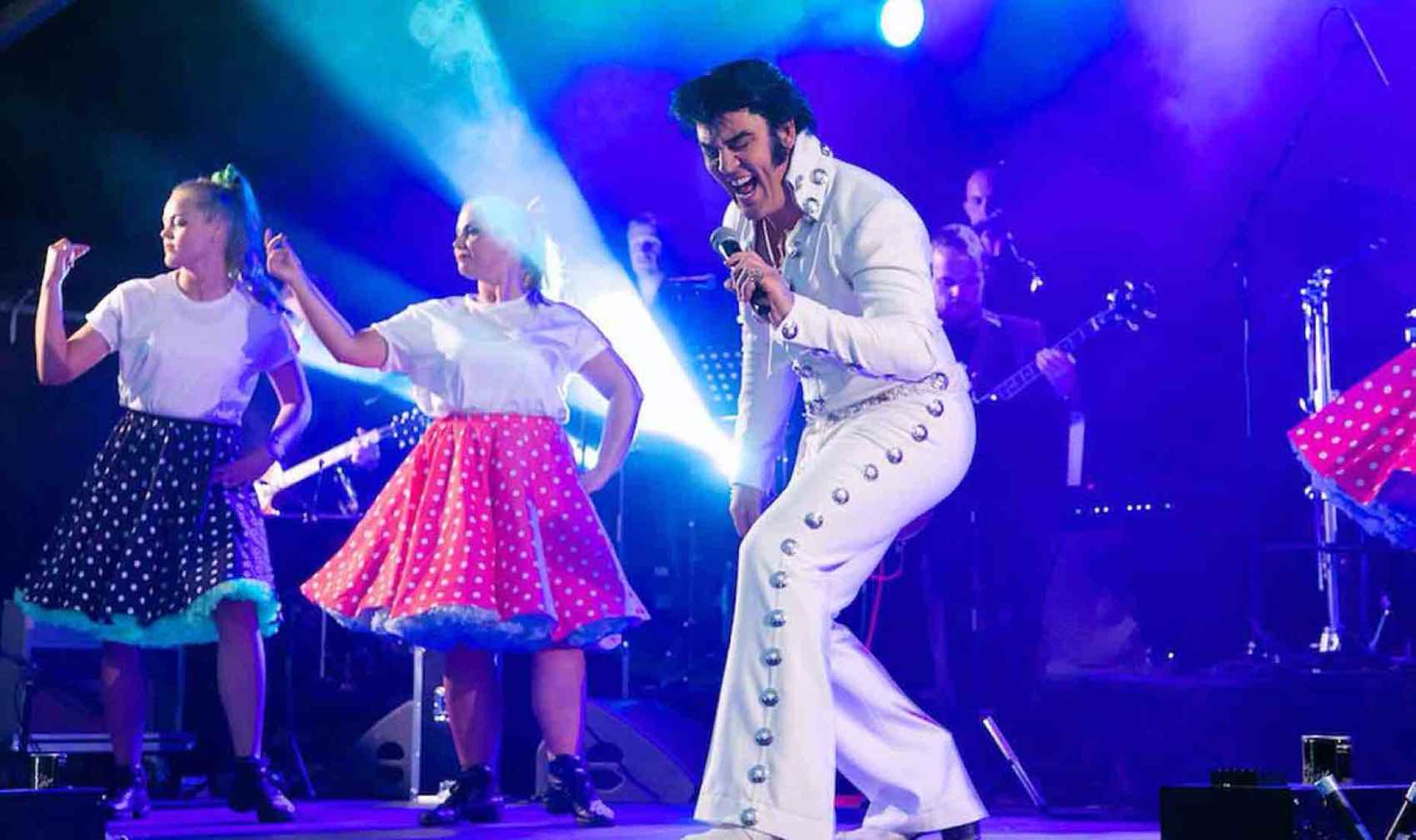 “Elvis show on stages in the Town Centre”. No fewer than three stages are set up in the centre of Måløy. On both Friday and Saturday, concerts perform on the stages throughout the day.
