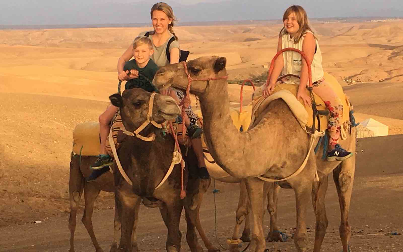 A minivan took us to the Agafey desert. Only one hour drive out of town. Marrakech camel ride was a good move and scored highest amongst the kids. We were greeted by again, Mohammed, and his five camels in the middle of nowhere. Lilly rode alone and I rode with Ludo on camels called Fatima and Banana.