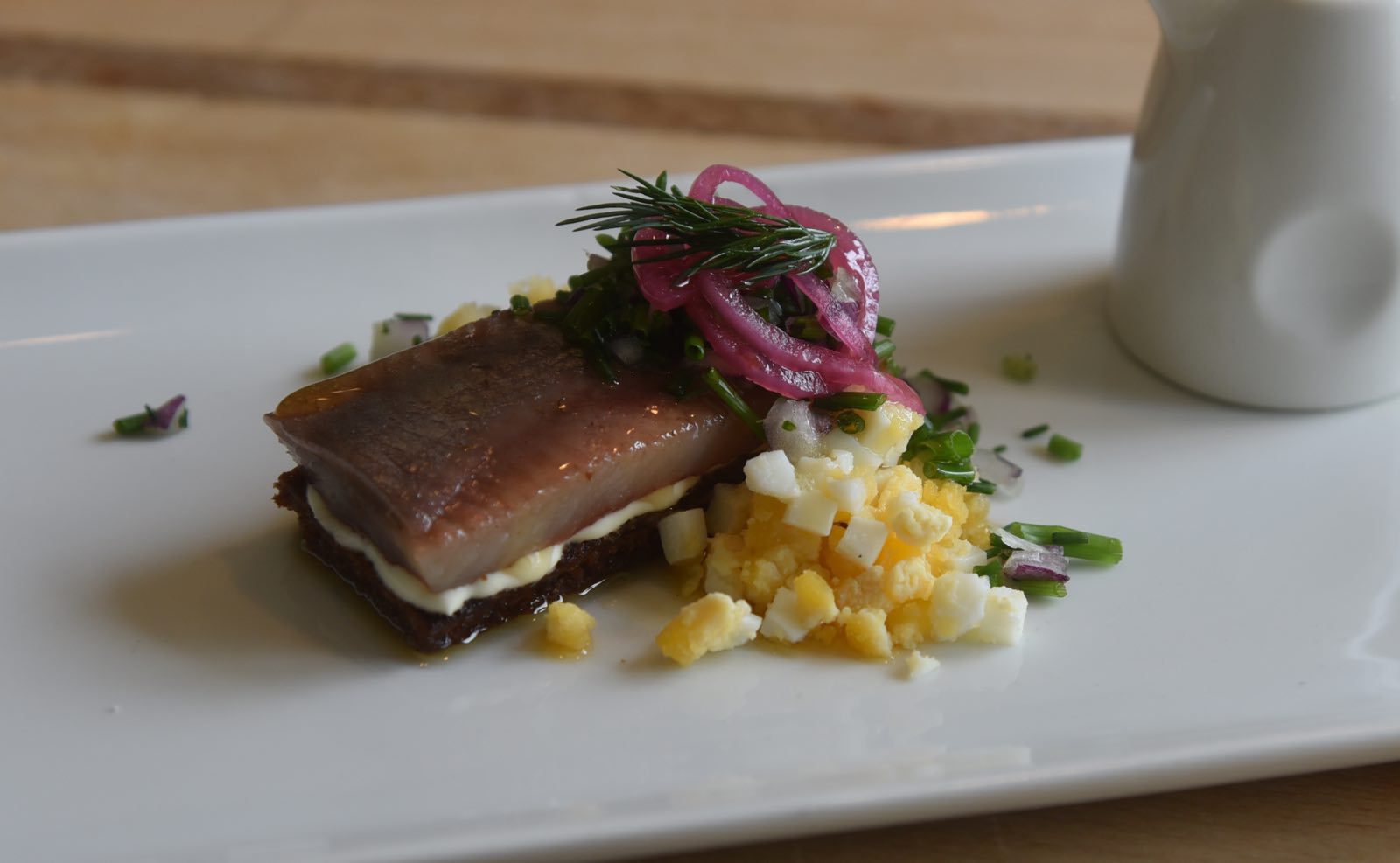 The very best bite came as Matjes, it´s herring soaked in preserving liquid and served with Löjrom, onion and browned butter on Danish rye bread. I fully understand the decision of replacing farmed salmon with Mates herring. I finished my meal with Catch of the day, it came as pan fried mackerel.